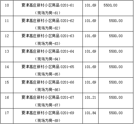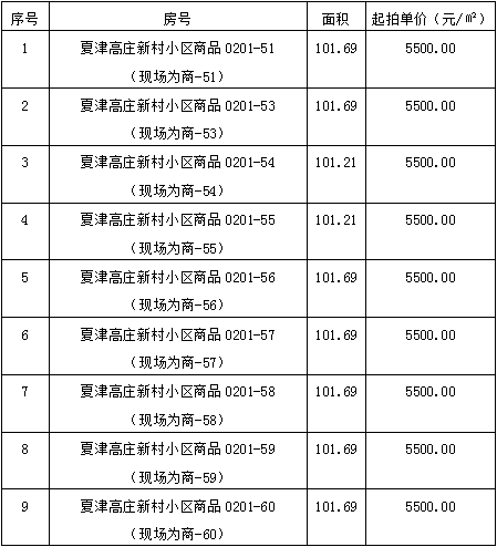 2、夏津高莊新村小區(qū)商品房17套。房產(chǎn)建筑面積為101.21-101.84平方米,參考價為556655元-560120元。競買保證金5萬元/間。多賣多交。